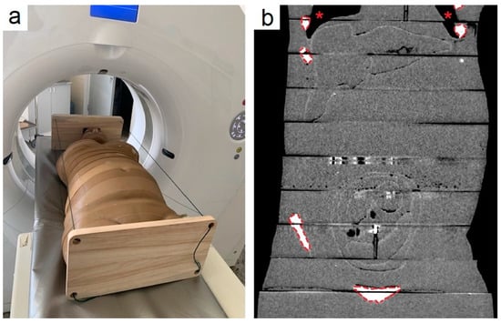 Anthropomorphic physical phantom, Tena, placed inside the CT scanner gantry (a). A coronal plane of the CT scan of the phantom (b) showing its composition, BTS (dashed red lines), LTS (red asterisk), and STS (rest).