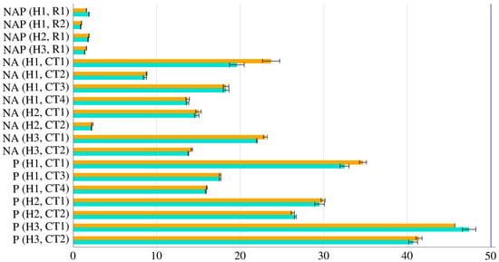 Absorbed dose for each specific scenario measured in the fetal head and body in three hospitals. NAP—non-specific abdominal pain; NA—nephrolithiasis, appendicitis, abdominal pain; P—polytrauma; R—radiography unit as labeled in Table 3; CT—computed tomography unit as labeled in Table 3; H—hospital. The line represents a fetal dose of 50 mGy, which the American College of Radiology suggests as an upper threshold for pelvic CT imaging protocols for a pregnant patient [29]. Uncertainty of the mean is presented with SEM.