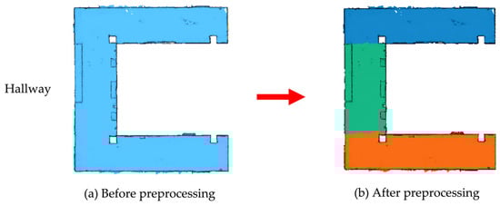 Section 2.2, we conducted data preprocessing according to the characteristics of different navigation spaces, with a particular focus on processing hallways and stairwells, as well as the supplementation of virtual doors. Additionally, the preprocessing step effectively removed noise points from the data, ensuring higher accuracy and reliability of the semantic point clouds.