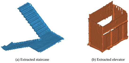 In general, stairwells consist mainly of the staircase and landing. The staircase is an important component that connects the topological relationship between different floors. In this study, we mainly preprocessed the data for the staircase part and extracted the staircase elements from the stairwell individually. Additionally, we also extracted the elevator element from the elevator lobby. The illustration of the extracted staircase and elevator is shown in