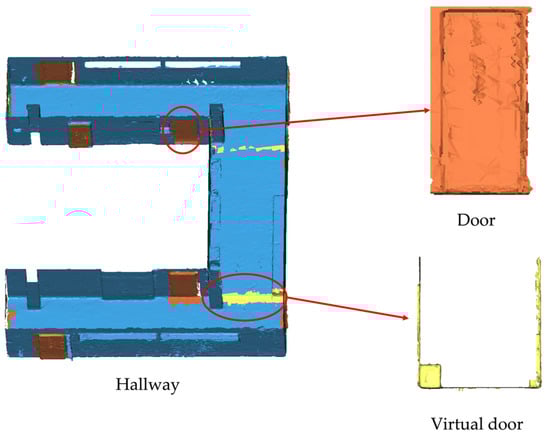 Figure 4. It is worth noting that, because our virtual doors are manually segmented, we did not extract the virtual doors using a uniform thickness standard during the segmentation process. As a result, in some cases, the thickness of the virtual doors may vary. However, this difference does not affect the primary function of the virtual doors in the navigation network, which is to connect adjacent spaces that lack physical doors but have walkable shared boundaries.