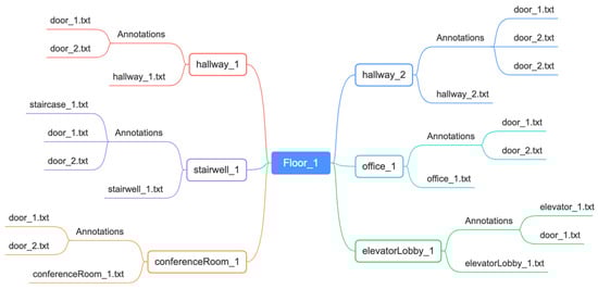 Additionally, to ensure the consistency of the file storage structure, all data are saved following a uniform file tree structure. For example, in the hypothetical Floor 1 scene of a building, this scene includes 2 hallways, 1 stairwell, 1 elevator lobby, 1 office, and 1 conference room. The corresponding file tree for the semantic point clouds in this scene is shown in