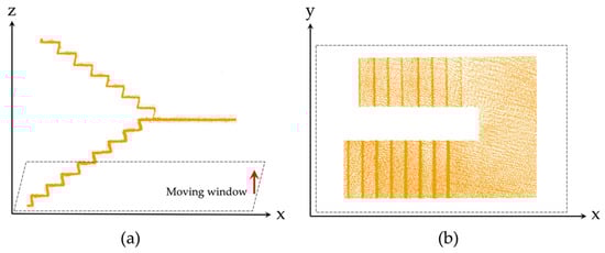 Figure 6. This method calculates the bounding box of the point cloud data representing the staircase to understand its spatial extents. The point cloud data are then processed in slices incrementally along the
