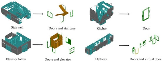 31]. We classified the point clouds into general space (e.g., offices, conference rooms, and storage), connection space (e.g., doors and virtual doors) and transition space (e.g., hallways and stairwells), as shown in