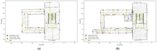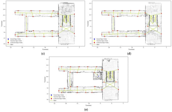 Since the semantically segmented point cloud files representing the same door in the general space (e.g., office) and transition space (e.g., hallway) directories may have slight differences in detail, but are generally consistent, such as points distribution or number of points, the extracted centroids for the same door may be different. To accurately identify duplicate nodes, we employed a distance threshold-based method.