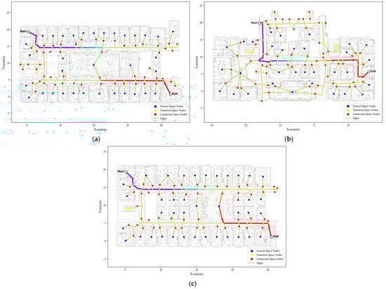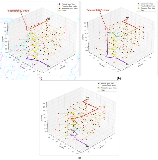 To evaluate the effectiveness of our approach, we first validated the method using the S3DIS dataset. Subsequently, we conducted further validation on a self-collected dataset, which consisted of 3D data from a multi-floor building captured using HoloLens 2 and pre-processed to generate the required semantic point clouds. This two-step evaluation demonstrated the robustness of our method across various spatial environments. Finally, we evaluated the path planning capabilities of the navigation network using the Dijkstra algorithm. The results showed that our network effectively supports spatial connectivity analysis and performs well in different indoor environments. Additionally, wheelchair accessibility was considered, and the paths were correctly determined.
