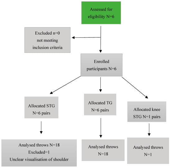 Participants gave their age, height, and weight and signed a consent form prior to filming. Based on these data, judokas were organized in pairs in order to be of similar weight to a feasible extent, reflecting the method used in competitions. Six different tori performed three STG throws and three TG throws each within their pair, having a total of 18 throws for each technique. One of the pairs performed an STG throw three times with tori kneeling while performing the throw, resulting in both judokas on the ground after the completion of each throw. This was to observe whether there is a difference in shoulder kinematics between the standing and kneeling STG. Thirty-nine (39) throws were performed in total. Throws that were presented incorrectly or not in frame were repeated, and recordings would be completed when each tori performed three (3) throws on uke. The participant flow chart is found in Figure 4. STG recordings were kept separate from TG recordings to avoid mistakes. Between each throw, participants were given adequate time to rest, before proceeding to the next throw, to ensure their safety and the validity of the technique displayed.