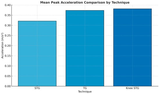 Figure 5 illustrates the comparison of mean peak acceleration across the three analyzed techniques: STG, TG, and knee STG. This visual representation highlights the observed differences in acceleration values.