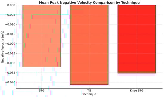 Figure 6 demonstrates the mean peak negative velocity values for STG, TG, and knee STG, highlighting the statistically significant difference observed in TG.