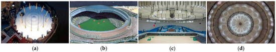 Large-span spherical dome structure at home and abroad. (Reproduced from Baidu Images (2024), as permitted under the Creative Commons Attribution License Agreement). (a) Millennium dome; (b) Fukuoka Open and Closed Dome Gymnasium; (c) Ejin Horo Sports Center; (d) China Coal Trading Center.