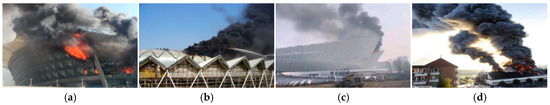 Fire incidents in large-span structures both domestically and internationally. (Reproduced from Baidu Images (2024), as permitted under the Creative Commons Attribution License Agreement). (a) Shanghai Hongkou Sports Stadium Fire; (b) Jinan Olympic Sports Center Fire; (c) Linyi Olympic Sports Center Fire; (d) Denmark Copenhagen Stadium Fire.