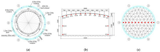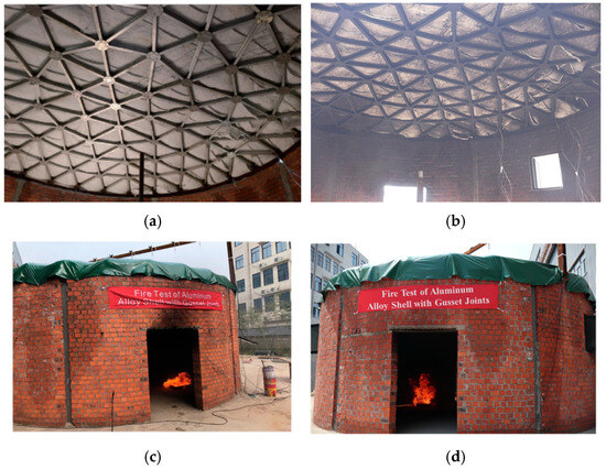 Guo et al. [44,45] investigated the fire resistance of aluminum alloy single-layer reticulated shells through scale model fire tests, which were designed to encompass varying fire source powers, positions, and ventilation conditions. The test model, depicted in Figure 3a, consisted of an aluminum alloy spherical reticulated shell with a span of 8 m and a height of 0.5 m, covered with fireproof and ceramic fiber fabric, and a lower supporting structure. This structure was anchored by fixed hinges and included a load-bearing steel framework and masonry infill walls. The heat release rates for the fire tests were 143.11 kW and 357.77 kW, corresponding to fire areas of approximately 0.25 m2 and 0.49 m2 for medium and high power fires, respectively