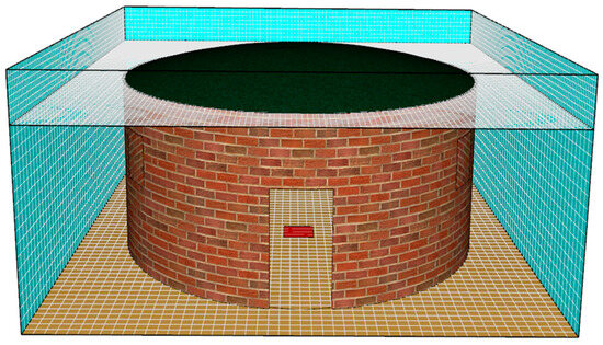 In the formula, D* is the characteristic diameter of the fire source (m); Q represents the heat release rate (kW), 20,000 kW; T0 is the environmental thermodynamic temperature (K), 286 K; the gas density (kg/m3) at ρ0 ambient temperature is usually 1.2 kg/m3; the specific heat capacity of air at constant pressure C0 is generally 1.004 kJ/(kg·K); g is the acceleration of gravity (m/s2); and the ratio of D* to grid elements should be between 4–16, so the grid size should be between 0.20–0.80. Considering the running time of the computer and the storage capacity of the computer, the grid size should be 0.7 m × 0.7 m × 0.7 m. The mesh division of the spherical dome structure model is shown in Figure 11.