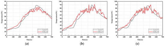 Comparison of temperature–time curves in Test 4. (a) G5; (b) G7; (c) G9.