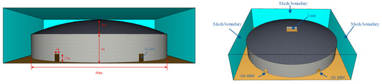 Section 2.1 confirms the precision and efficacy of the numerical simulation methodology for fire temperature fields. Given spatial limitations, this method is applied to analyze the fire temperature field of a large-span spherical dome structure with a 60 m span. The model depicted in Figure 8 features a spherical dome with a 60 m span, 9 m column height, and a rise-span ratio of 0.1. Utilizing natural smoke exhaust and ventilation, the model simulates a 20 MW fast fire at the center of the ground. In accordance with the European Code [47], the heat release rate is set at 500 kW/m2, covering an area of 40 m2, with a simulation duration of 2000 s. In PyroSim, the simulation assumed a windless environment. The turbulent large eddy numerical simulation (LES) method was used to solve the Navier–Stokes equation for fire simulation. The initial ambient temperature was set to 20 °C, and the initial atmospheric pressure was 1.01 × 105 Pa. Mesh boundary conditions were set to open. The model material was set as shown in Table 3. The calculated smoke exhaust volume for this model is 45.11 m3/h, equivalent to 16.2 × 104m3/h, which complies with the ’technical standard for smoke management systems in buildings’ [48] as shown in Table 4.