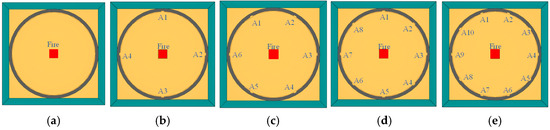 To investigate the effects of natural air inlet opening areas on the temperature field and smoke flow within a large spherical dome structure during a fire, five distinct working conditions were established for numerical simulation, with CASE0 serving as a control without an air inlet. The scenarios incorporating natural air inlets featured total areas of 20 m2, 30 m2, 40 m2, and 50 m2 [49], symmetrically arranged as depicted in Figure 9, where A denotes the number of air inlets. These inlets were designed to augment the ambient air, with detailed settings provided in Table 5.