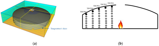 The temperature measurement setup involves the systematic placement of slices along the X, Y, and Z axes, with corresponding measuring points uniformly distributed throughout the spatial domain. The THCP01-THCP05 measurement points are arranged near the roof and are separated by 5 m in the horizontal direction, as shown in Figure 10.