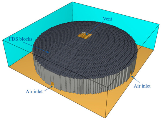 Building upon the experimental data, FDS was utilized to model the air temperature field within the shell structure under fire conditions and to perform a subsequent field simulation analysis. The FDS model is briefly described as follows: