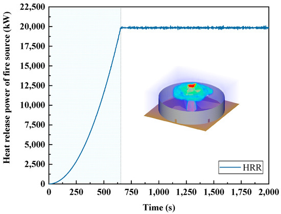 In PyroSim, the growth form of fire source power is set to Q = αt2, where the value of α determines the burning rate of fire source. According to the actual situation, it is set to fast fire, at this time α = 0.04678. Therefore, when the fire source power reaches 20 MW, the fire development time is 652 s. Figure 12 illustrates the variation of the heat release rate (HRR) over time. The establishment of a smoke exhaust system is crucial for maintaining a normal and reasonable fire source power during the numerical computation of temperature field models, thereby ensuring the precision and reliability of finite element calculation outcomes. This method of smoke exhaust is instrumental in upholding the fire source power at a level that is both typical and rational within the numerical simulations of spherical dome large space structures.