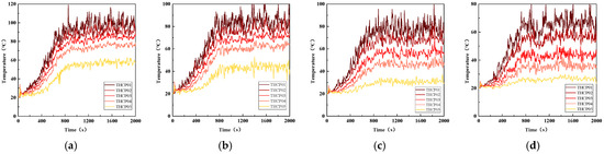 The temperature–time changes of the five measuring points near the roof are shown in Figure 16. When the fire is in a strong period, the heat release rate of the fire source reaches a maximum value, and the indoor temperature also reaches a maximum value. In the early stage of the fire, the temperature rises rapidly. With the increase of time, the temperature gradient decreases and the heating rate slows down. Finally, when the heat exchange between indoor and outdoor reaches a dynamic balance, the temperature tends to a certain value, which is the maximum value that the temperature can reach. The heating curve is similar in form and is divided into two basic stages: the rapid heating stage in the early stage of the fire, and the stable stage after the indoor and outdoor heat reaches equilibrium.