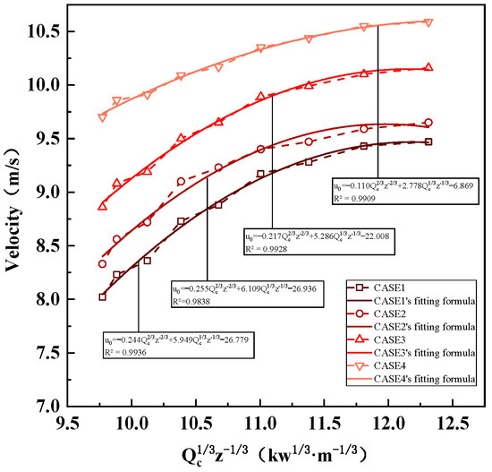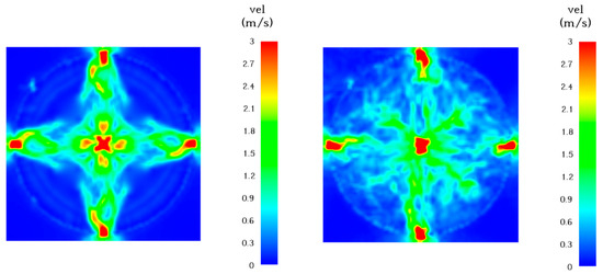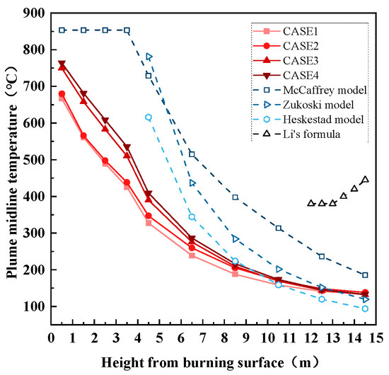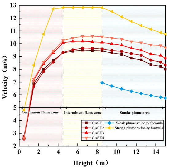 Through numerical simulation analysis, the axial temperature and velocity of the axially symmetric fire plume are obtained. As shown in Figure 17, due to the symmetrical distribution of the inlet, the fire plume still presents the characteristics of approximately axisymmetric distribution. Therefore, in the following related research and analysis, the fire plume is analyzed as an axisymmetric fire plume model.