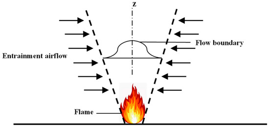 Figure 18 shows the schematic diagram of the fire plume generated by the combustion of combustibles [50]. Due to the thermal feedback of the fire, the volatiles generated by the combustion are mixed with the ambient air to form a diffusion flame. A dotted line stretching upward on both sides of the flame represents the boundary of the plume, that is, the boundary of the entire plume composed of combustion products and entrained air.