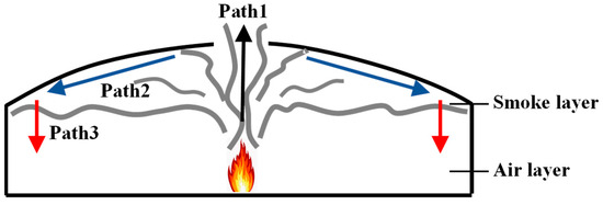 The fire phenomenon, despite its inherent complexity, adheres to natural laws and can be encapsulated within empirical formulas, experimental data, or control equations that describe the combustion process [4]. Pioneering work by Morton et al. [5] in 1956 introduced the virtual point source concept, positing that the plume originates from such a point. Subsequent researchers, including Thomas [6], McCaffrey [7,8], Zukoski [9,10], and Heskestad [11,12], expanded upon this foundation, advancing the understanding of smoke behavior in building fires. Tanaka and Yamana [13] built upon Zukoski’s entrainment formula to conduct theoretical analyses of smoke control in large spaces, deriving simplified formulas for calculating smoke layer heights under various ventilation scenarios, including natural filling, side wall exhaust, and mechanical smoke extraction, complemented by full-scale experimental validation. The NFPA 92B [14] standard elucidates the physical model underpinning fire smoke movement in large spaces, detailing smoke exhaust calculations and control requirements, and provides the mass entrainment formula for the plume model, further enhancing the comprehension of smoke management in such settings.