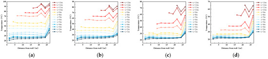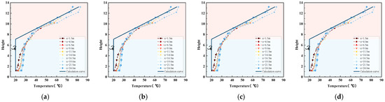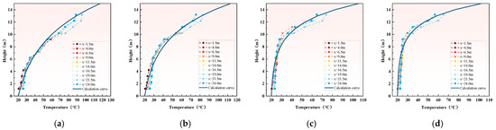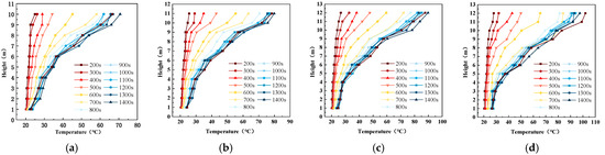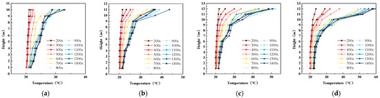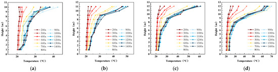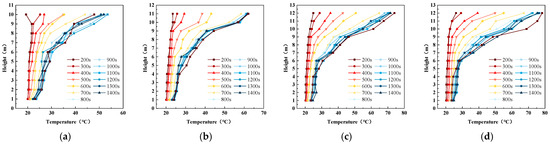 Temperature curves with height: (a) CASE1; (b) CASE2; (c) CASE3; (d) CASE4.