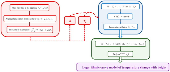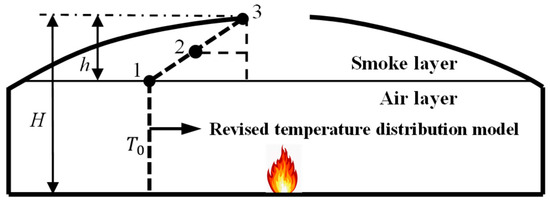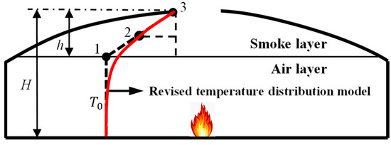 However, the calculated temperature of the air layer is quite different from the simulated value. It is because the air layer temperature is assumed to maintain the initial temperature of 20 °C, but in fact the air temperature also changes with height, and the boundary between the smoke layer and the air layer is not obvious. Therefore, it is not accurate to use this model to describe the relationship between the temperature of the large space and the height. The temperature model of the double zone should be modified. The temperature–height curve is highly fitted with the logarithmic curve [55]. The logarithmic curve model is used to modify the temperature distribution at the height. The modified temperature model is shown in Figure 32, and the formula is Equation (47). Because the maximum temperature of the flue gas layer calculated by the linear distribution relationship is in good agreement with the simulated value, it can be applied to the calculation of the logarithmic curve. Therefore, the unknown parameters , , and in the formula can be obtained by calculating the curve through three points—initial temperature , average temperature of the smoke layer , and maximum temperature of the smoke layer .