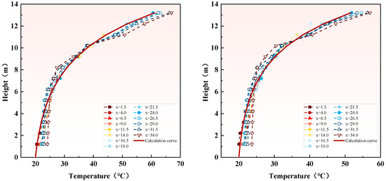 It can be seen from the calculated temperature change curve with height (Figure 26) that the temperature change rate in the flue gas layer is in good agreement with the calculated slope, so the temperature near the ceiling can be obtained more accurately. The calculated temperature near the ceiling is shown in the table. The calculated temperature at a higher height is in good agreement with the simulation results.