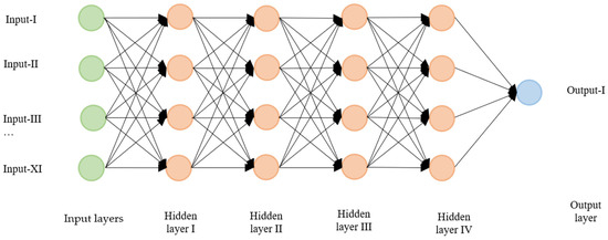 In this study, four distinct machine learning methodologies were employed: an ANN, RF regression, SVR, and time series. For the ANN approach, a feedback model was designed, comprising eleven input neurons and a single output neuron. Through iterative experimentation, it became evident that a configuration featuring four hidden layers, each containing four neurons, yielded more effective outcomes. The architecture of the model developed is depicted in Figure 2.