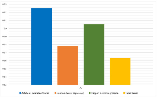 Figure 3 shows the R2 analysis. The R2 is a statistical measure used to assess a model’s performance in regression analysis. It indicates how closely the data align with the regression line. In other words, it shows how much the dependent variable will change, on average, in terms of its own unit of measurement, when the independent variable changes by one unit in its own unit of measurement [59]. The study’s findings revealed that the R2 metric was 92.5% for the ANN, 87.8% for RF regression, 90.5% for SVR, and 86.3% for the time series. The R2 metric, ranging from 0 to 1, measures the fit quality of a regression model, with values approaching 1 indicating a superior fit. Although the ANN emerged as the most successful model in this analysis, all four models demonstrated efficacy in their predictive capacities.