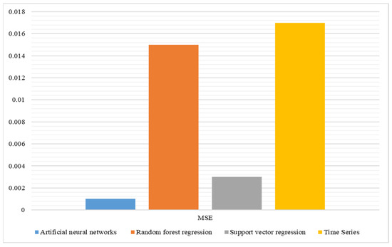 Figure 4 shows the MSE analysis. The MSE serves as a metric to gauge the accuracy of a regression model’s predictions compared to actual values. It is determined by finding the average of the squared differences between the predicted and true values. A lower MSE signifies better model performance [60]. This study found that the MSE metric for the ANN was 0.001; for RF regression, it was 0.015; for SVR, it was 0.003; and for time series, it was 0.017. Although the model with the fewest errors in this study was the ANN, it was found that the error rates of all four models were low and acceptable.