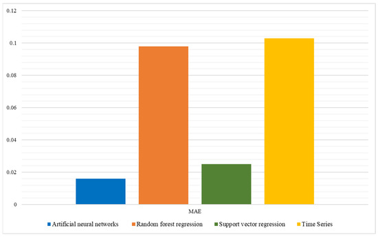 Figure 5 shows the MAE analysis. The MAE metric calculates the sum of the absolute differences between the predicted values and actual values. Essentially, it quantifies how far away each prediction is from the true value [61]. This study revealed values of 0.016 for the ANN, 0.098 for RF regression, 0.025 for SVR, and 0.025 for the time series. The ideal value of the MAE is zero because it means that the predictions match the actual values exactly. Lower MAE values represent better model performance. This study found that the MAE value in all four models was remarkably close to the ideal one.