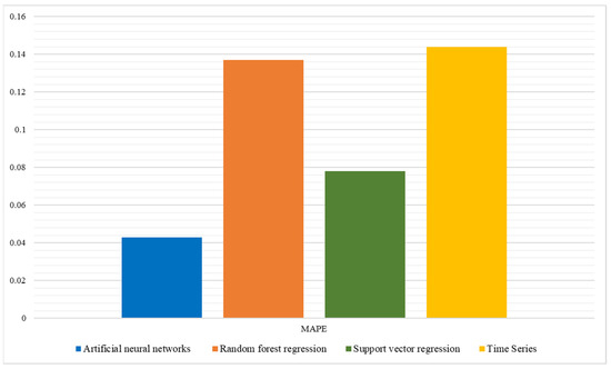 Figure 6 shows the MAPE analysis. The MAPE metric shows the incorrectness of each prediction as a percentage compared to the true value [60]. This study revealed values of 0.043 for the ANN, 0.137 for RF regression, 0.078 for SVR, and 0.144 for time series. It is widely recognised that the nearer the value of the MAPE is to zero, the more accurate the predictions are.