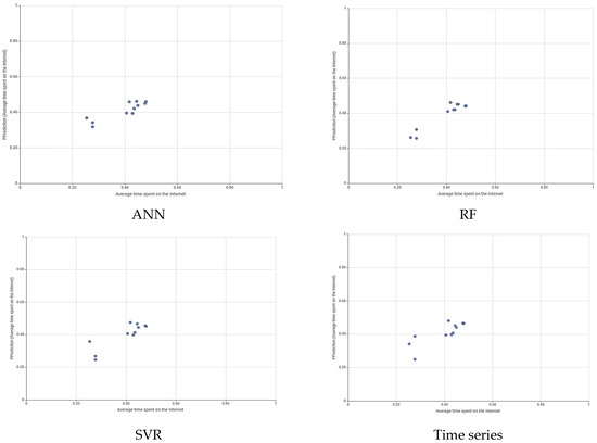 A scatter plot is used to explore how two values change in relation to each other across two dimensions. With this diagram, although the reason for the relationship cannot be understood, the presence and strength of a relationship between two variables can be determined, facilitating classification into categories such as strong positive, weak positive, strong negative, weak negative, or no relationship [62]. Figure 7 shows the scatter plot curves for the ANN, RF regression, SVR, and time series methods.