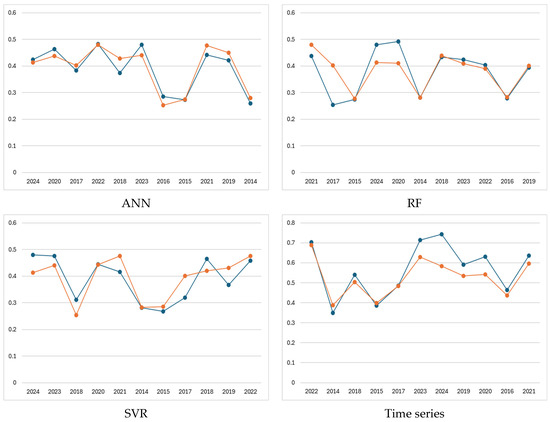 Although the artificial neural network (ANN) provided the highest accuracy rate among the models used in this study, the advantages and disadvantages of other models for different scenarios should be discussed. For example, the random forest (RF) model may be faster and more effective on small datasets with its less complex structure, while support vector regression (SVR) may give better results on non-linear data. The success of a time series model depends on the characteristics, seasonality, and non-linearity of the data, so the advantages of different models should be assessed for specific datasets. In future studies, it is suggested to evaluate the performance of more advanced models (e.g., LSTM and XGBoost) on complex datasets. These comparisons will be useful to determine which model is more appropriate in different contexts.