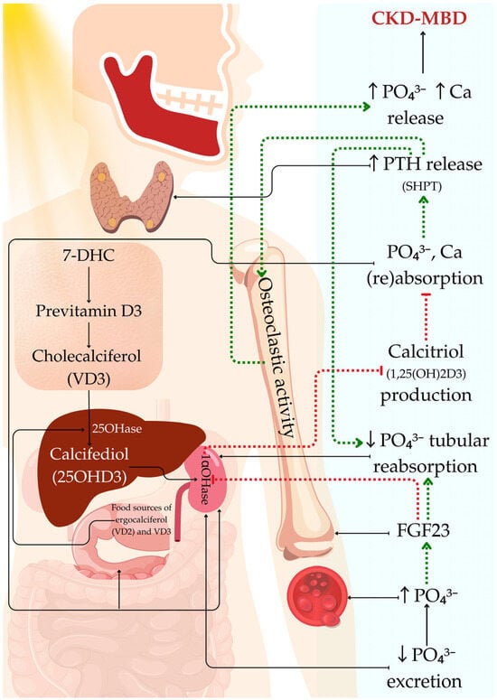 The pathogenesis of this disorder is very complex and involves numerous factors. First of all, in CKD, there is an increase in phosphorus in the blood levels, due to its reduced excretion. Hyperphosphatemia, in turn, involves the activation of a mechanism that begins with the increase in the levels of a factor called fibroblast growth factor 23 (FGF23). This is mainly responsible for controlling plasma levels of phosphate and reduces their tubular reabsorption; consequently, it increases their urinary excretion []. Therefore, the FGF23 activation in the early stages of the disease attenuates hyperphosphatemia. On the other hand, the increase in FGF23 levels has a further consequence; that is the reduction in the 1α-hydroxylase activity, which, as we will see in the next paragraph, is responsible for the activation of vitamin D. Vitamin D deficiency is in turn responsible for the reduction in calcium intestinal absorption []. The reduction in circulating calcium levels stimulates the parathyroid glands, which increase the release of PTH; the latter is implicated in the renal excretion increase in phosphates, and, at the same time, is responsible for bone calcium reabsorption. As a consequence, PTH stimulates the activity of osteoclasts that cause bone demineralization, thus promoting the release of calcium but, at the same time, compromising the bone structure and increasing the risk of fractures [,]. This complex mechanism is known as secondary hyperparathyroidism and is responsible for all the alterations that involve calcium–phosphorus metabolism.