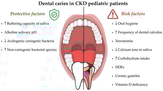 The contrasting results, reported in the literature regarding caries pathology and CKD, could also be related to different risks and protective factors of dental caries that can vary according to the study sample examined. In particular, the risk factors of dental caries in CKD patients that could justify the high prevalence are poor oral hygiene, dental calculus accumulation, xerostomia, high carbohydrate intake, DDEs, uremic gastritis and vitamin D deficiency. The risk factors are detailed below: