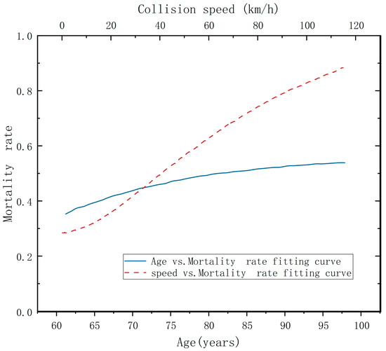 The collision speed, age, and mortality rate are fit to obtain Figure 2. The analysis shows that, at low collision speeds (0–30 km/h), the mortality rate remains low and increases gradually. However, when the speed reaches 50 km/h, there is a noticeable increase in mortality, and when the speed exceeds 90 km/h, the mortality rate surpasses 80%. As age increases, the mortality rate gradually rises. While the fluctuations in mortality rate due to age are relatively small, the starting rate is high, reflecting the elevated risk of death for elderly pedestrians in traffic accidents.
