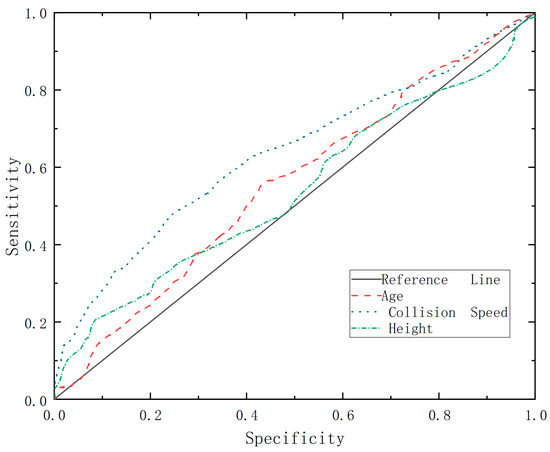 Based on the above analysis, it is clear that the age, collision speed, and height of elderly pedestrians significantly influence the mortality rate. The ROC (receiver operating characteristic) curve for each factor in relation to the mortality rate is shown in Figure 1. The ROC curve for collision speed is clearly above the reference line, indicating that collision speed plays a major role in predicting traffic accident mortality, with the highest impact on mortality and an AUC (area under the curve) value of 0.64. The ROC curve for pedestrian age is also above the reference line, although slightly lower than that for collision speed, it still shows good predictive power, with an AUC value of 0.56.