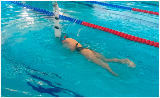 The test was conducted in still water, in conditions provided in the previous study [24] (Figure 1). Before the test, the participants underwent a 1000 m swimming warm-up and became familiarized with the test procedure and conditions. During the test, the maximum pulling force 60Fave (N) and the oxygen consumption (L·min−1) for the whole 60 s (breath by breath) were measured. VO2peak was the average oxygen consumption during the last 30 s of the test.