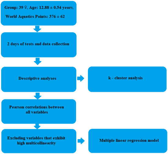 Multiple linear regression models involving the backward stepwise procedure were developed by entering all variables significantly correlated to the swimming speed. Additionally, indices included in the regression were checked for data redundancy (all > 0.2) and for autocorrelation with the use of the Durbin–Watson test (all ≤ 2.0). Variables were checked for multicollinearity resulting in excluding them from further analysis. The calculations were performed with the PQStat software (version 1.8.6); only power analyses were conducted with the G*Power software (version 3.1). The statistical significance was set at p ≤ 0.05. The study design is presented in Figure 2.