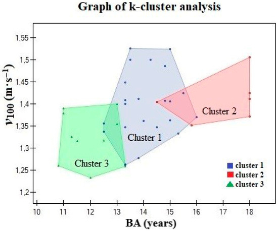 Eriksson et al. [13] investigated the influence of maturation on anaerobic energy production and concluded that this pathway of energy production was higher among adults than in children. Our study confirms Eriksson findings, faster maturation process (higher BA) results in higher energy production (60Fave, v100); correlation was also found between BA and v100 (r = 0.40; p = 0.01). Also, Sokołowski et al. [11] reported moderate-to-strong significant correlations between O2max, Fave, and BA but did not identify a mediation effect of BA with regard to the correlation between v100 and SL or SR. The cluster and ANOVA analyses performed in the present study indicated significant differences between the distinguished cluster groups in terms of the individuals’ BA (F = 44.03, p < 0.000001). It is interesting that only late-maturing girls (cluster 3, BA: 11.94 ± 0.95 years) were significantly slower than the biologically older ones (cluster 1: 14.07 ± 0.96, cluster 2: 17.05 ± 1.53), and the differences in v100 between clusters 1 and 2 turned out not significant (1.39 ± 0.08 vs. 1.41 ± 0.05 m·s−1).
