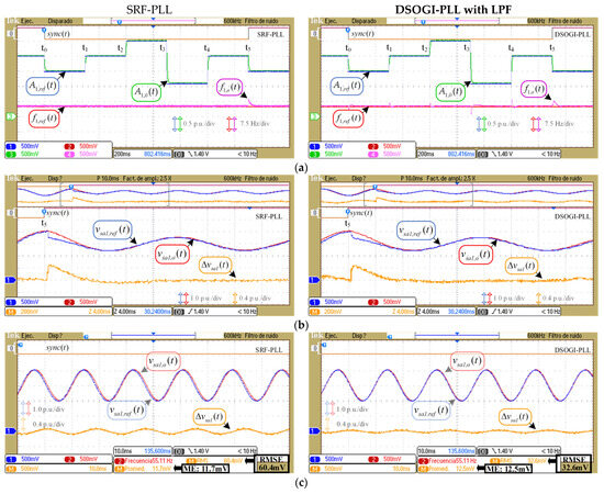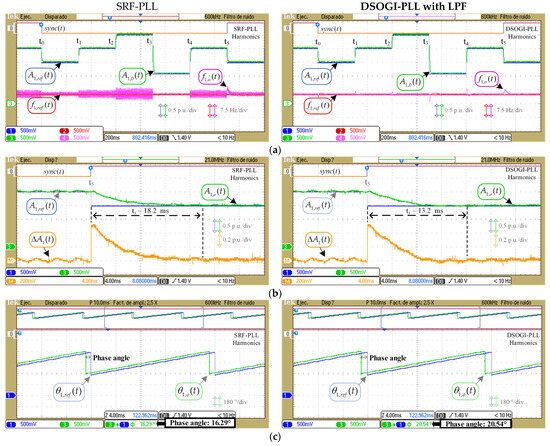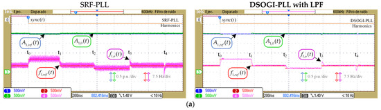 The performance of the SRF-PLL (left column) and DSOGI-PLL with LPF (right column) algorithms with the proposed evaluation tool. Case study 2, frequency variation with the harmonic content: (a) references and estimated signals; (b) reference, estimation, and error of frequency in change , measuring and OS in with .