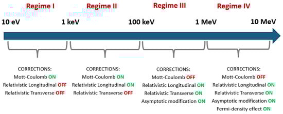The theoretical framework adopted in the present work for the calculation of electron inelastic cross sections is the Relativistic Plane Wave Born Approximation (RPWBA) where the probability of ionization and excitation of the medium is essentially described by the energy loss function (ELF) which is defined by the imaginary part of the reciprocal dielectric function (see below). The present inelastic model, hereafter denoted as “DNA-Opt4X”, includes all the latest modifications to the ELF (presented in [43,44,50]) that reduced the sum-rule errors to less than 1.5% (from 6.5% in DNA-Opt2). In addition, both the low- and high-energy corrections are implemented as described in [50]. However, to efficiently extend the model above 1 MeV, additional corrections and modifications have been implemented as will be described in the next sections. Since the various corrections involve additional cross section calculations (which are often far more time-consuming per data point than the uncorrected calculations), we restrict the application of each correction to specific energy regimes where a sizeable impact is expected (see Figure 1). The optimum transition energy (from one regime to the next) may depend on the application. As a first approximation, we here adopt a more general approach (also used in [50]) where the transition energy is based on the impact of the correction to a fundamental and well-understood radiation dosimetry quantity, namely, the electronic stopping power. Therefore, corrections are applied only within the energy range in which their individual effect on the electronic stopping power is larger than 1%. Based on this criterion, and in order to make the model implementation more transparent to future modifications, we distinguish between four energy regimes as depicted in Figure 1.