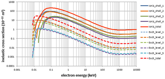 In Figure 2, we present calculated cross sections in the energy range from threshold up to 10 MeV for each ionization shell and excitation level using the present model (DNA-Opt4X). The cross sections exhibit the typical behavior of a rapid increase above the threshold energy of each inelastic channel and a subsequent decrease, due to the inverse proportionality to the square of the electron velocity, up to about the electron rest mass energy (~500 keV) where relativistic effects set in. At even higher energies, the so-called relativistic rise may be observed (practically above ~1 MeV). As expected, above a few tens of eV ionization cross sections become larger than the excitation cross sections. This is a direct consequence of the underlying ELF model which uses ordinary and derivative Drude functions (the latter decreasing more rapidly with energy) to model the ionization and excitation transitions, respectively.