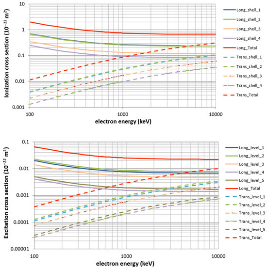 where the integration limits of the energy transfer are , , and with and being the binding energy of the j-th ionization shell and the transition energy of the k-th excitation level, respectively, of the medium. Note that, as written in Equations (2) and (3), corresponds to the so-called macroscopic cross section or inverse mean free path with units 1/length.