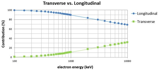 The relative magnitude of the longitudinal and transverse contribution to the total inelastic cross section is shown in Figure 4. It can be seen that the transverse contribution is ~1% at 100 keV, ~2% at 200 keV, ~10% at 1 MeV, and ~30% at 10 MeV. Thus, when extending MCTS simulations to electron energies beyond a few hundred keV (and especially beyond 1 MeV), the inclusion of the transverse term of the inelastic cross section is necessary so as to avoid a significant (and systematic) overestimation of the inelastic mean free path.