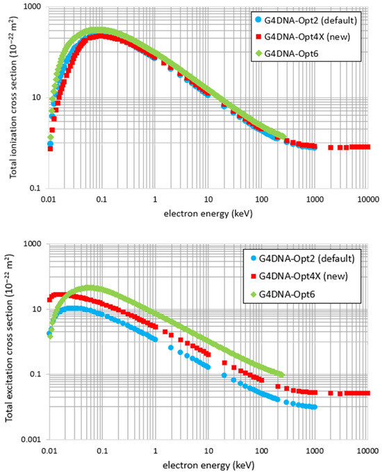 Figure 5 shows a comparison of the total ionization (top panel) and total excitation (bottom panel) cross section between DNA-Opt2, which extends up to 1 MeV, the present model (DNA-Opt4X), which extends up to 10 MeV, and DNA-Opt6 which extends up to 256 keV. The differences at low energies are discussed elsewhere [43,44]. In brief, the differences between the two dielectric-based inelastic models (i.e., those of DNA-Opt2 and DNA-Opt4X) are due to the different ELF algorithms and the different implementations of the low-energy Mott–Coulomb corrections. These differences yield ionization cross sections which differ by up to ~50% at sub-100 eV energies but less than ~10% above ~100 eV. On the other hand, the ionization cross sections of DNA-Opt6, which are calculated by the Binary-Encounter-Bethe (BEB) model [45], are consistently higher, especially for sub-100 eV energies. This is mainly due to the neglect of long-range screening effects in the BEB (being essentially an atomic model). In contrast, differences in the excitation cross section persist over the entire energy range. Specifically, the excitation cross section of the present model (DNA-Opt4X) is consistently larger (by a factor of ~2) from DNA-Opt2 due to differences in the ELF parameterization [43,44]. These differences are further enhanced at very low energies (<50 eV) due to the partitioning algorithm implemented in DNA-Opt4X which re-distributes the oscillator strength below the binding energies of each ionization shell under the constraints of the sum-rules. Interestingly, noticeable higher excitation cross sections are observed for DNA-Opt6 which is based on the dielectric function parameterization of Dingfelder and co-workers [49,54]. Note that DNA-Opt6 uses a hybrid inelastic model with an atomic model for ionizations and a dielectric model of excitations [45].